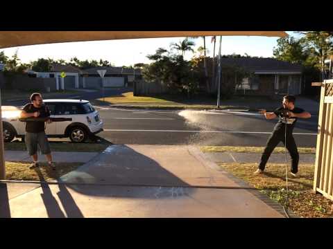 Who would win in a battle between a man wielding a Karcher high pressure cleaner and a man with a STIHL backpack blower.
